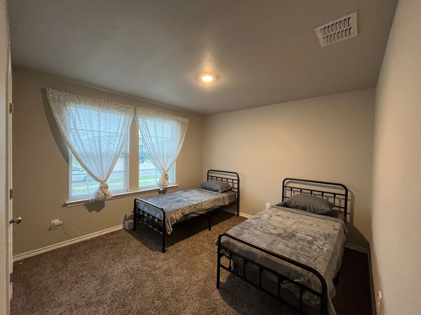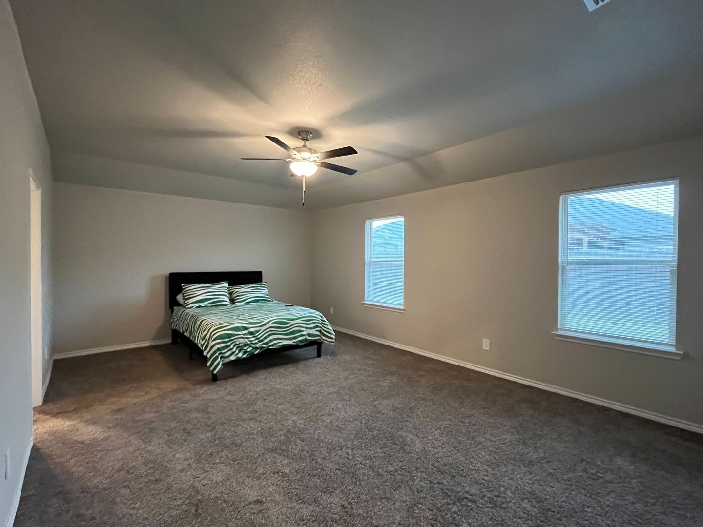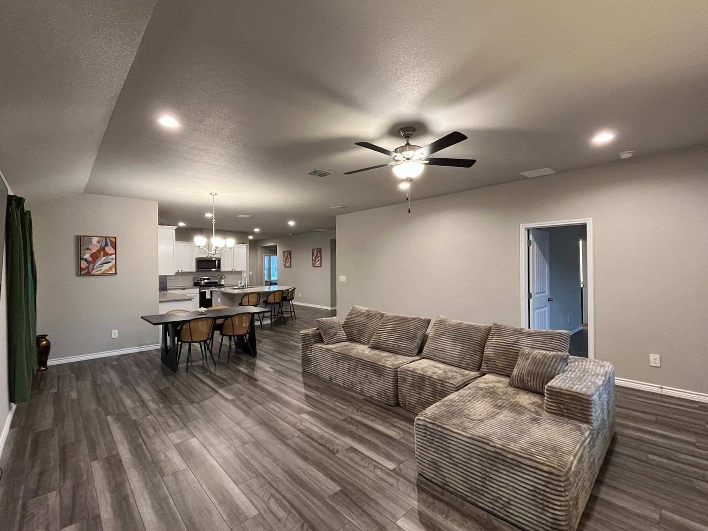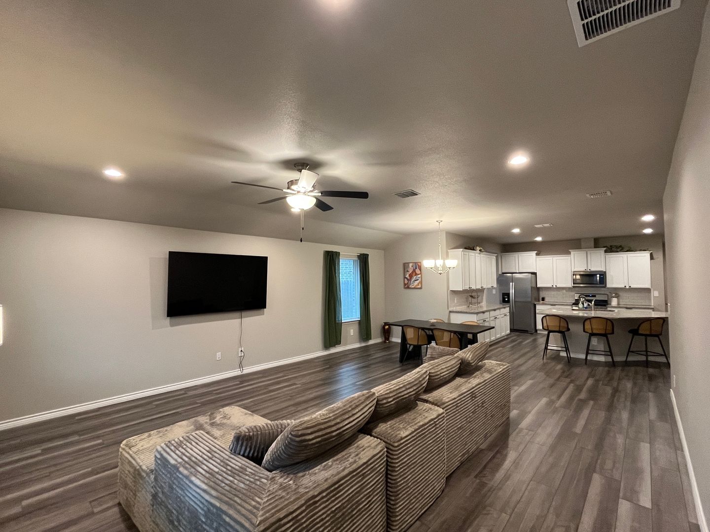 Spacious four bedroom two bath house with split bedroom floorplan in Starlight Estates on the South Side. Granite countertops and luxury vinyl plank throughout. Carpet in the bedrooms. Walk into a small foyer that leads you into the kitchen with lots of countertop and cabinet space, five burner gas range, island with double basin sink and eat in breakfast bar, plus a separate pantry! Living room off the kitchen boasts lots of windows that allow for plenty of natural light to fill the rooms and provides access to the covered patio and fully fenced in backyard. Two bedrooms up front correspond to a hall bath with open shelving and tub shower combination. Third bedroom off the kitchen. Primary bedroom tucked away in the back of the house with plenty of room for large furniture boasts a walk in shower, double sinks, separate w.c. closet, and large walk in closet. Quick commute to schools, Bill Witt City Park, shopping, restaurants, grocery, and so much more! Call a Realtor today to schedule a showing.