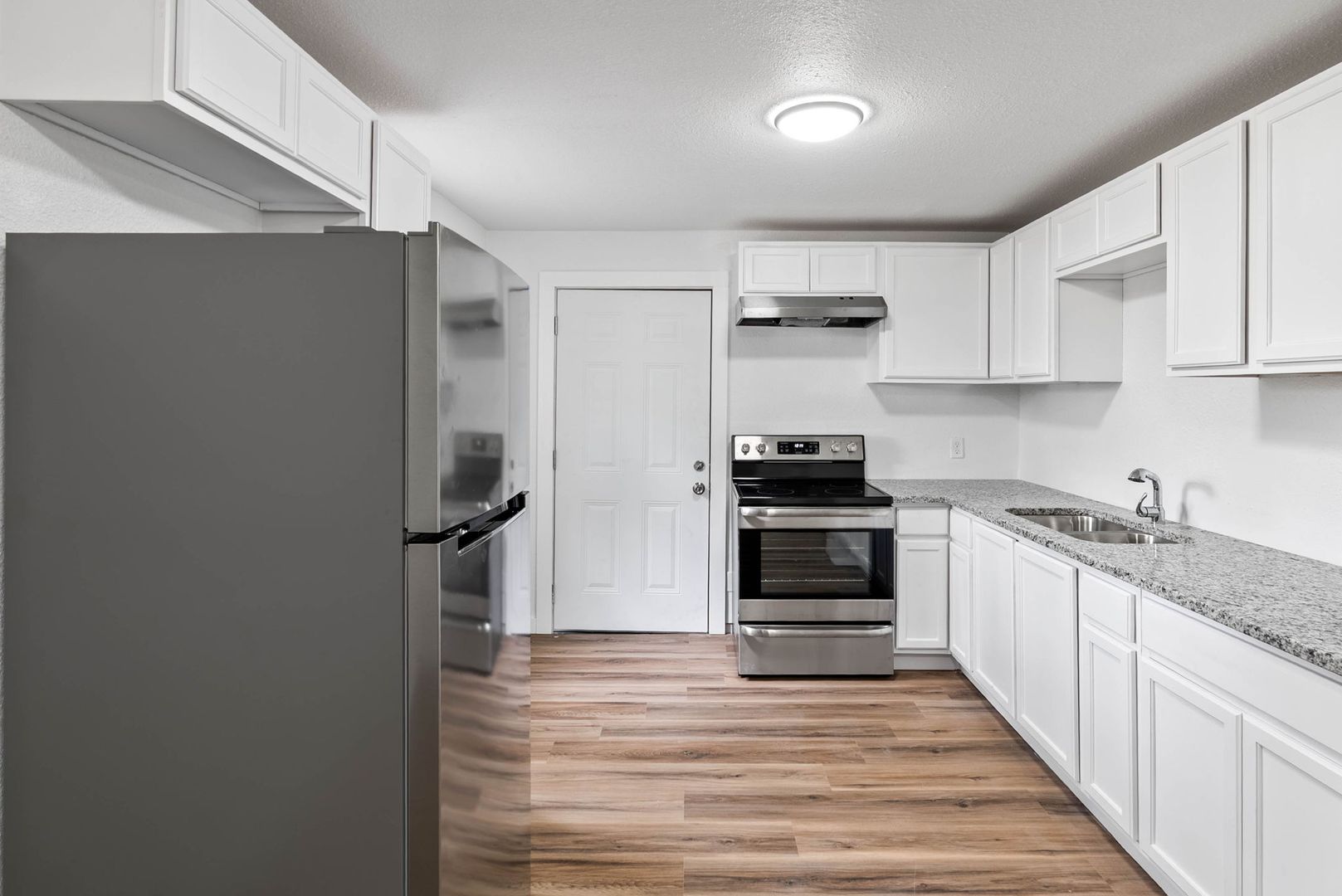 Updated three bedroom one bath home on a corner lot with luxury vinyl plank floors throughout, granite countertops, and fresh paint throughout! Front door opens up to a spacious and open living room that leads you into the dining room and and living room. Kitchen boasts stainless steel appliances, double basin sink, and lots of countertop and cabinet space plus access to the backyard. Washer and dryer connections tucked away in a closet. Bathroom boasts double sinks, open shelving, and a tub shower combination. All bedrooms boast windows that allow for natural light to fill the rooms and all have ceiling fans. Call a Realtor today to schedule a showing!